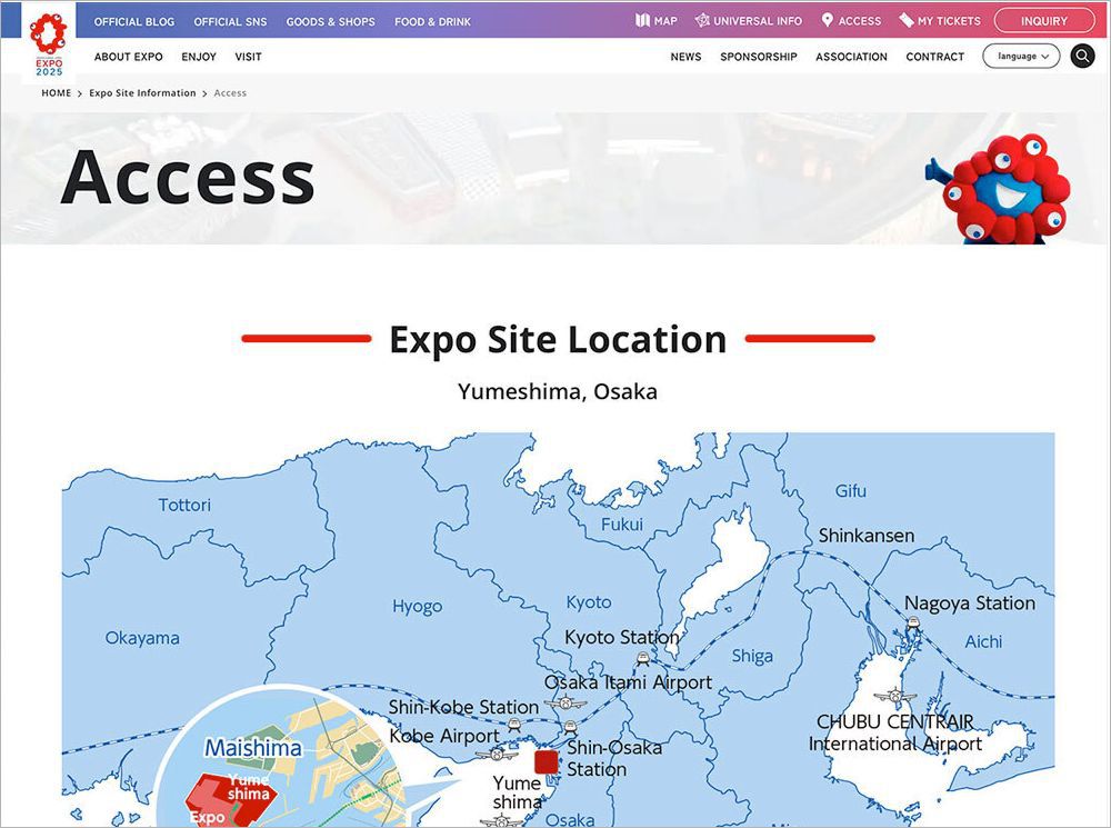 上の画像は、万博公式ウェブサイトの「アクセス」ページの英語版です。気になったのは、このページの表題です。「アクセス」という日本語は、「行き方」や「交通手段」の意味として、ここ何年も普通に使われています。しかし、英語の「access」に「行き方」や「交通手段」の意味はありません。「交通の便」という意味で「The airport has good access to the city.」(空港からは市内にも行きやすいです)といった言い方をしたり、「出入りする権利/要件」という意味で「I have access to a VIP lounge.」(私はVIPラウンジを利用できます)といった言い方はしますが、「行き方」を指す際に「How to access」などと言うことはありません。
