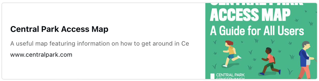 Central Park's topography can sometimes be challenging to navigate for users with limited mobility. To help with this, the Central Park Conservancy has created a map featuring information on how to get around in Central Park, with a particular emphasis on access for people with disabilities and/or limited mobility.