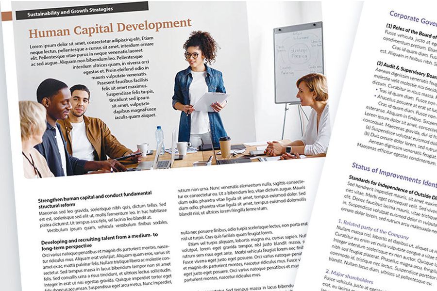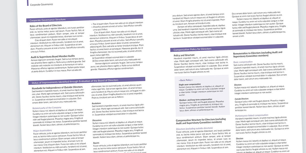 統合報告書の中でこうした稚拙なレイアウトがよく見られるのが、コーポレートガバナンスのセクションです。これは、実のところ、デザイナー/レイアウターだけの問題ではありません。小見出しの階層が異常に多い上に、本来同じ階層と思える小見出しの扱いを変えていたり(番号の有無など)、同じ階層の文章量がまちまちだったりなど、「デザイナー泣かせ」の原稿自体が要因です。そうした平仄が揃っていない原稿になっているのは、コーポレートガバナンス報告書などの別の文書の内容をそのまま流用するケースが多いからでしょう。インベスター・リレーション(IR)やステークホルダー・リレーションが投資家や利害関係者向けの「広報」であるという観点に立てば、事務的な文書をただ貼り付けただけのそうしたレポートのあり方(=編集)自体、見直すべきでしょう。ただ、大きな組織になればなるほど、そうした「前例踏襲」がなされるケースが多いのも事実です。