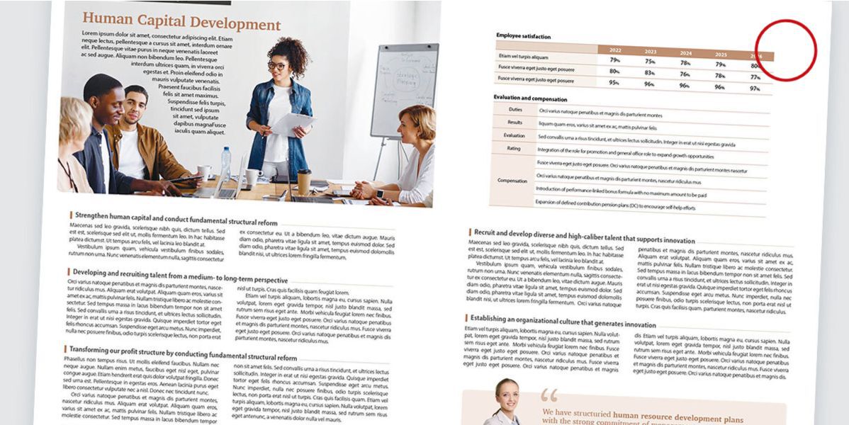 新聞記事の編集業務では、段間の空白が端から端まで通ってしまうレイアウトを「ハラ切り」と呼んで、タブーとしています。これは「ページもの」を扱っているデザイナーにとって本来「常識」ですが、統合報告書などの企業レポートには、なぜかこうした例が多く見受けられます。そうした編集の定石に精通している人が発注側にいないこと、もしくは、IRやサステナビリティ・レポートへ理解に乏しいデザイナーが少ないこと──その何れかまたは両方ではないかと思います。