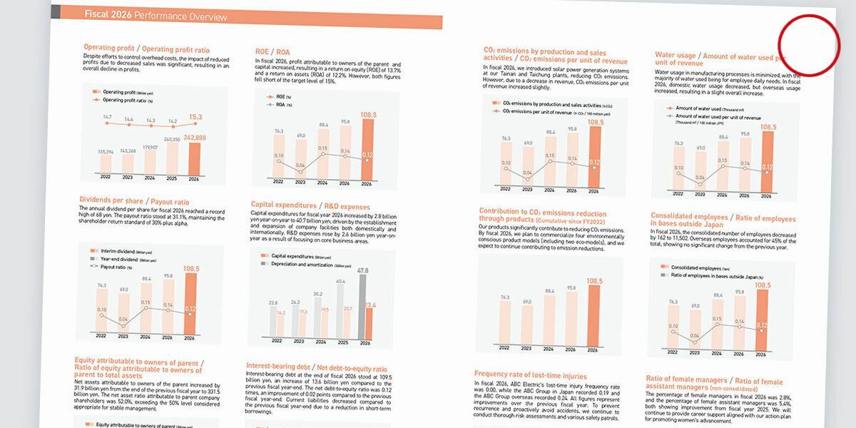 近年は、印刷〜製本を前提としない企業報告書が増えてきています。パソコンやタブレットでPDFを閲覧するスタイルの方が、コスト的にもユーザー側の使い勝手も優れていると言えるでしょう。ただ、その弊害か、最近の統合報告書には小さすぎる文字が多いように思います。全体的に文字が小さくなったというよりは、例えば、フォトキャプションや図表内の項目・注釈などが、印刷の時代ではタブーとされていたレベルまで小さくなっているのです。デジタルツールで閲覧する場合、拡大表示すれば良いのでしょうが、読む側にすればその一手間が煩わしいですし、少ない部数であっても印刷版を用意する企業もまだまだあります。