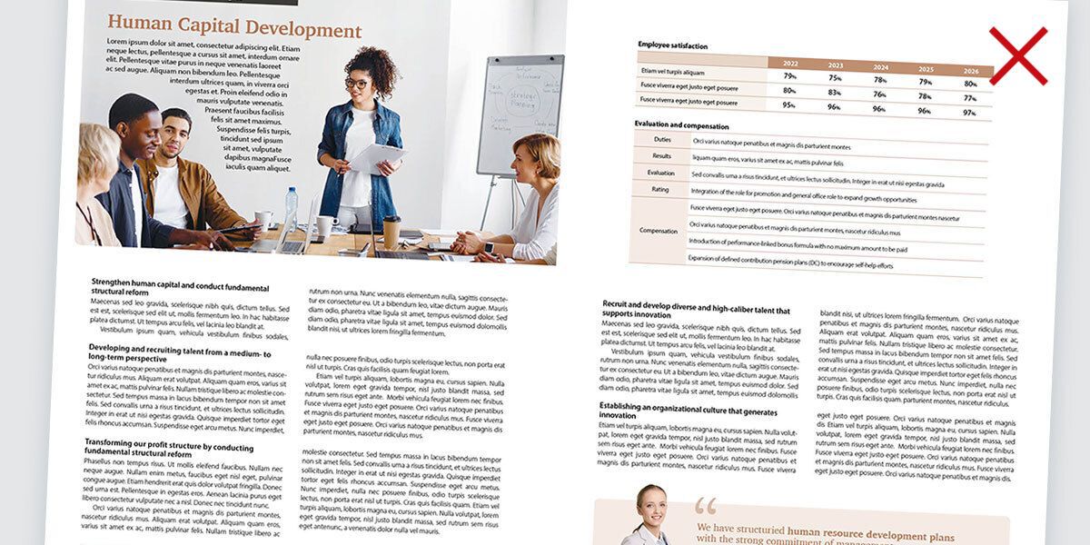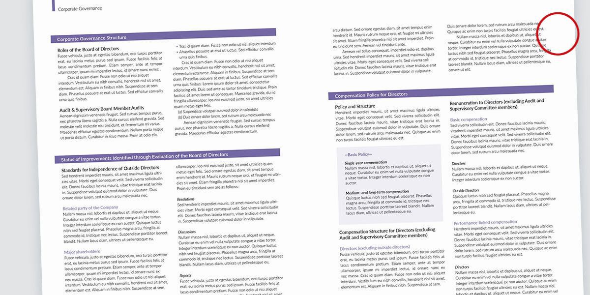 では、読みやすさへの配慮に欠けるレイアウトとはどのようなものを言うのでしょうか? 今回は、統合報告書を担当する日本人デザイナーが陥りやすいいくつかの例を検証してみます。