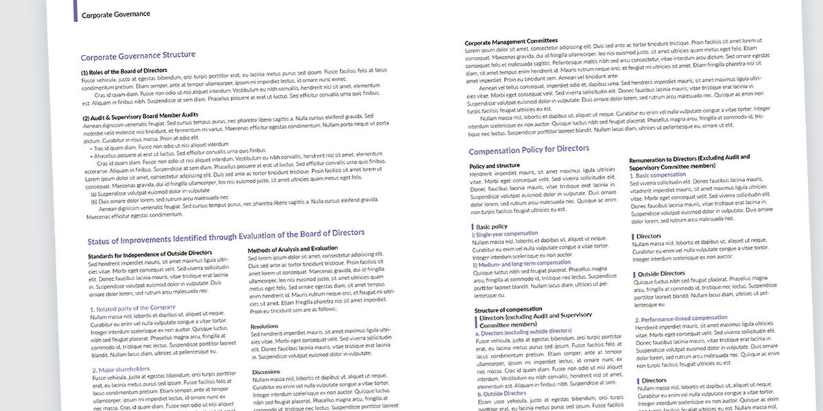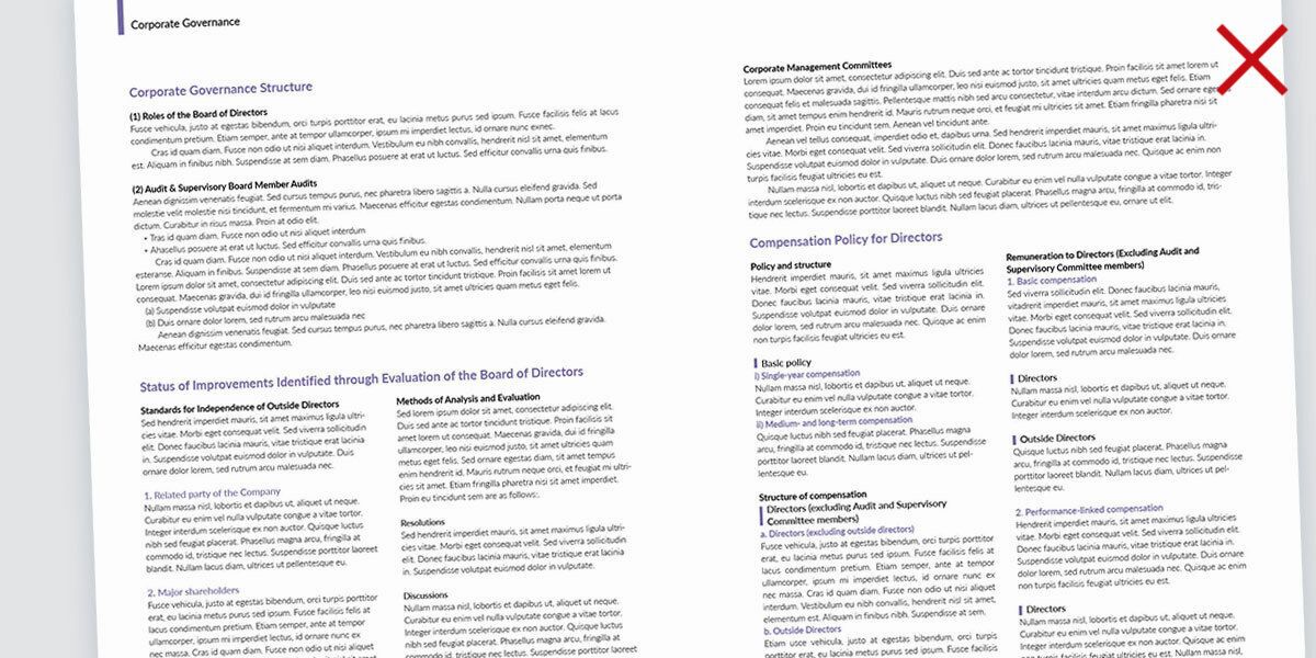 統合報告書の中でこうした稚拙なレイアウトがよく見られるのが、コーポレートガバナンスのセクションです。これは、実のところ、デザイナー/レイアウターだけの問題ではありません。小見出しの階層が異常に多い上に、本来同じ階層と思える小見出しの扱いを変えていたり(番号の有無など)、同じ階層の文章量がまちまちだったりなど、「デザイナー泣かせ」の原稿自体が要因です。そうした平仄が揃っていない原稿になっているのは、コーポレートガバナンス報告書などの別の文書の内容をそのまま流用するケースが多いからでしょう。インベスター・リレーション(IR)やステークホルダー・リレーションが投資家や利害関係者向けの「広報」であるという観点に立てば、事務的な文書をただ貼り付けただけのそうしたレポートのあり方(=編集)自体、見直すべきでしょう。ただ、大きな組織になればなるほど、そうした「前例踏襲」がなされるケースが多いのも事実です。